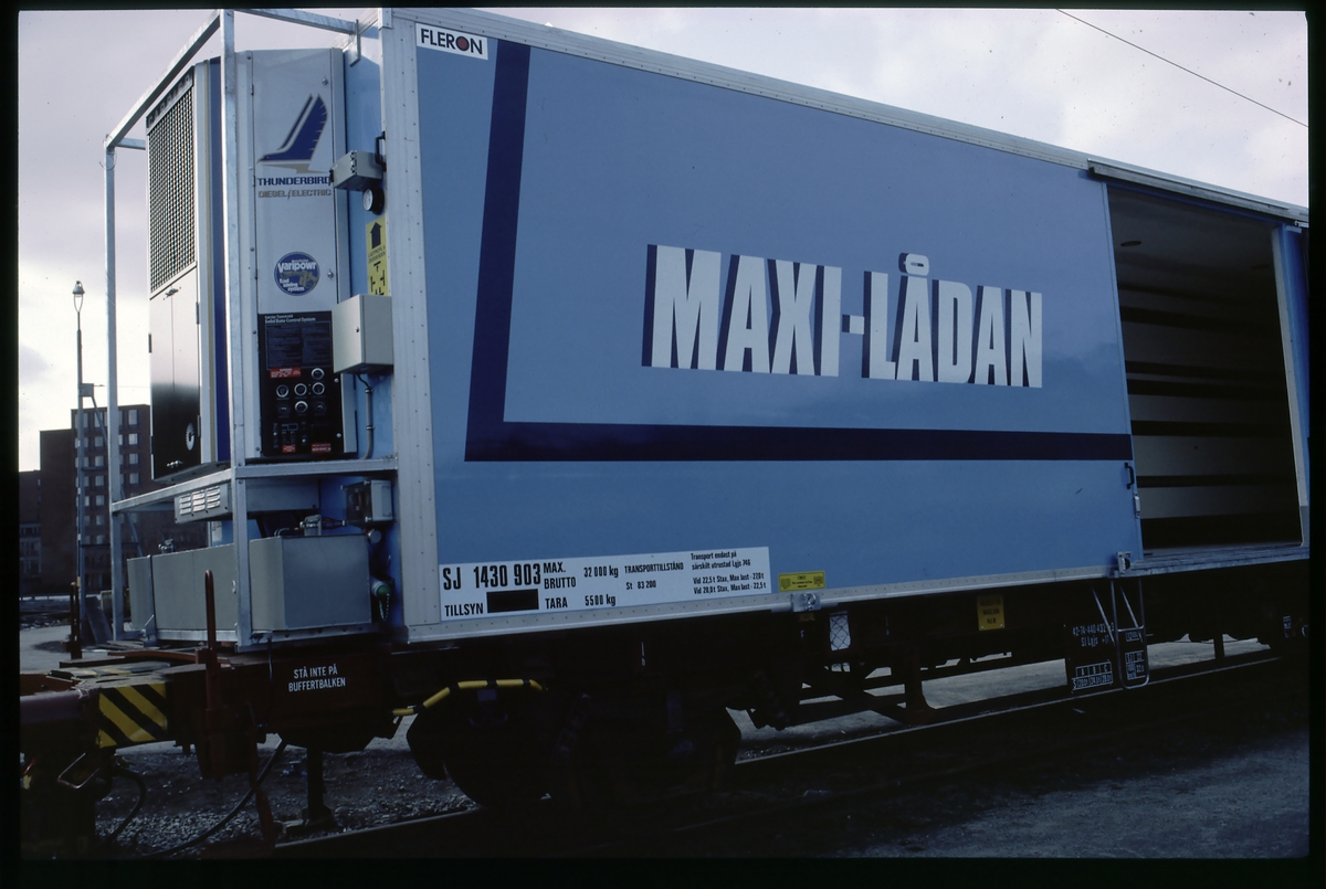 Godsvagn SJ Lgjs 42-74-440 4322-3. Livmsedelscontainer SJ 1430 903.