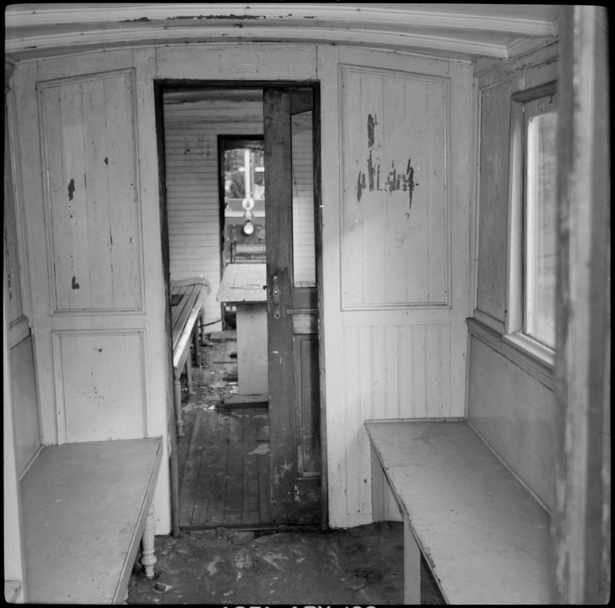 Personvagnar ankommer till Östra Södermanlands museijärnväg. Interiörbild.