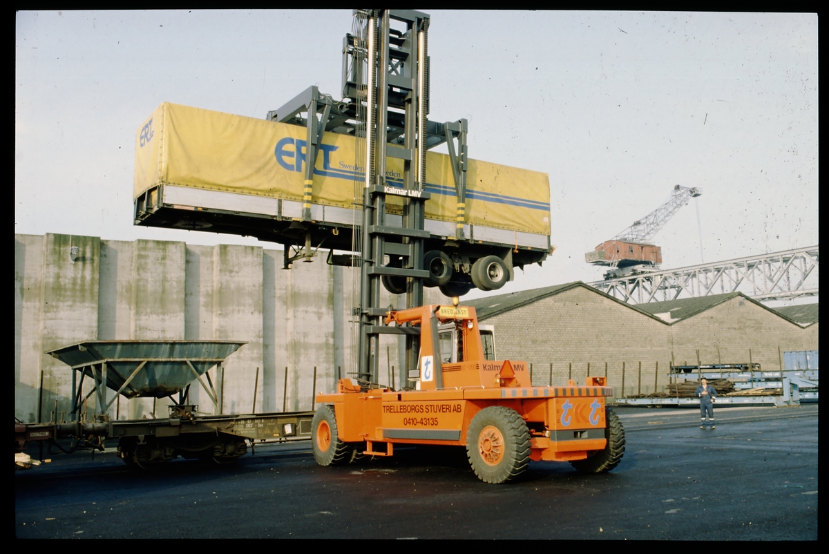 Lastning av lasbilssläp på SNCF Sss-vagn. Societe Nationale des Chemins de fer Francais.