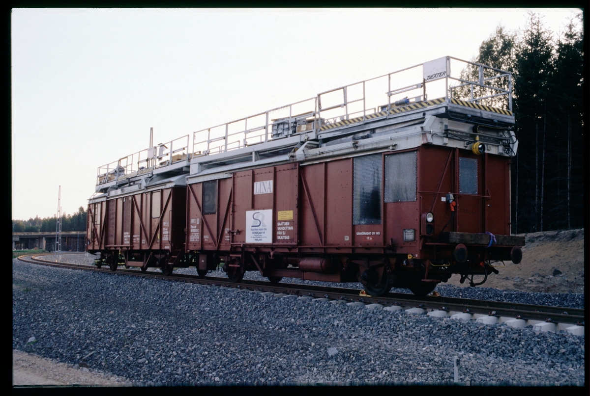 Elektrifieringståg bestående av VR Tnv-sr 911003-2 och VR Etv-sr 910006-6 på sträckan mellan Grundbro och Åkers Styckebruk.