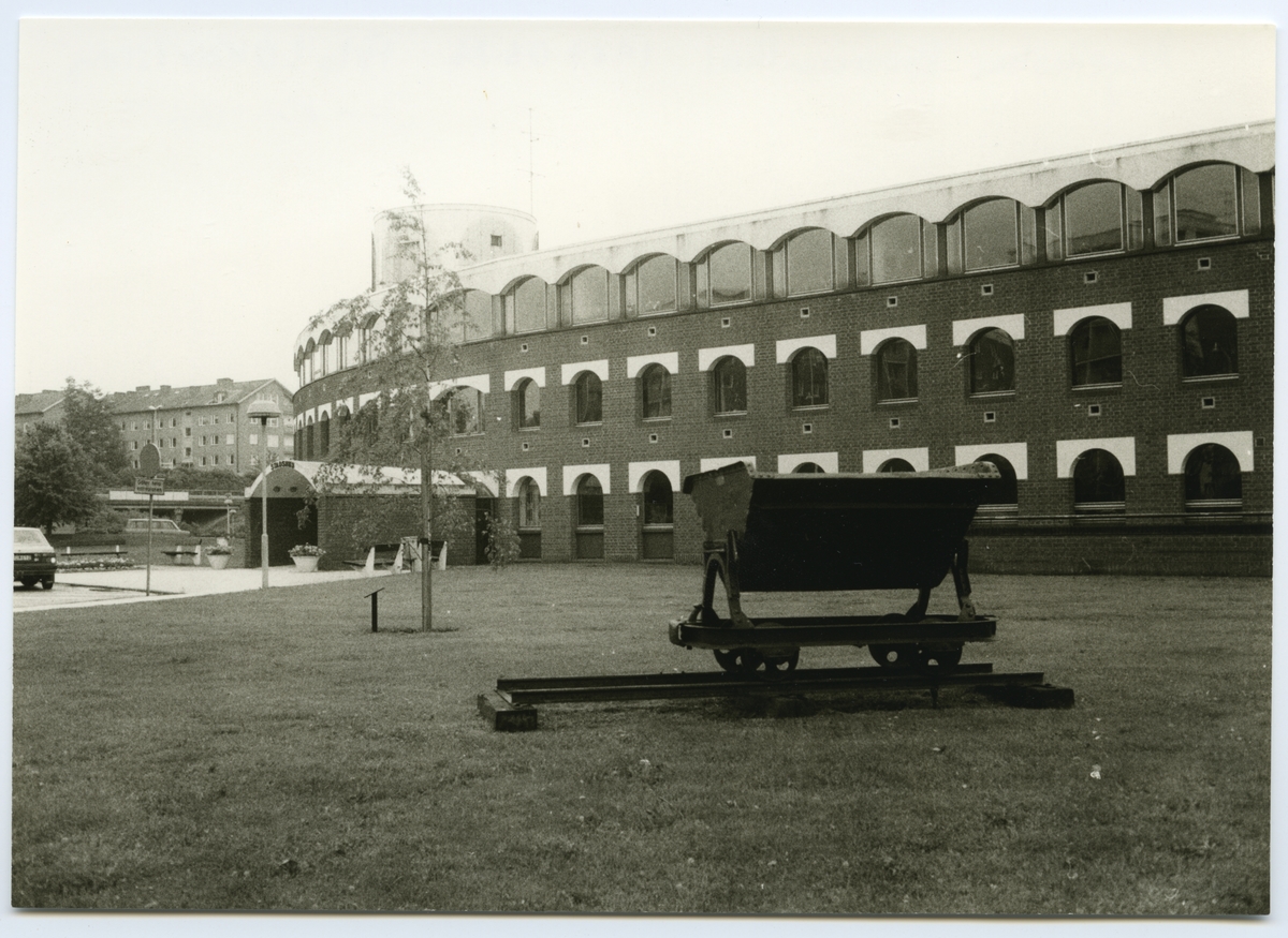 Tippbar godsvagn för lera eller sand. Ängelholms kommunalhus i bakgrunden.