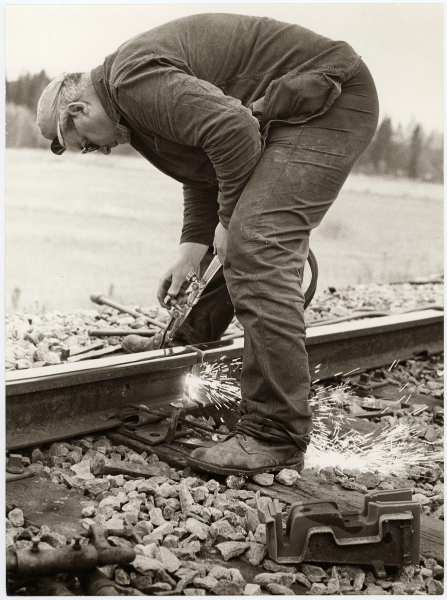 Arbete med att svetsa ihop rälsskenor för smidigare gång med Elektro-Thermit metoden pågår. Gunnar Andersson skär upp skarvöppningen med gas.