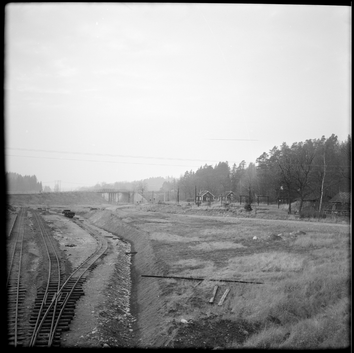 Titel: Pågående arbete med läggning av smalspår vid Läggesta Södra station där Museijärnvägen, Östra Södermanlands Järnväg, ÖSlJ förlänger bansträckningen.