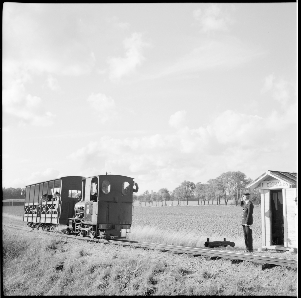 Museijärnvägen, Östra Södermanlands Järnväg, ÖSlJ ångtåg med lok 1"Lotta". Lokförare och stins gör honörhälsning vid station Hjorthagen.