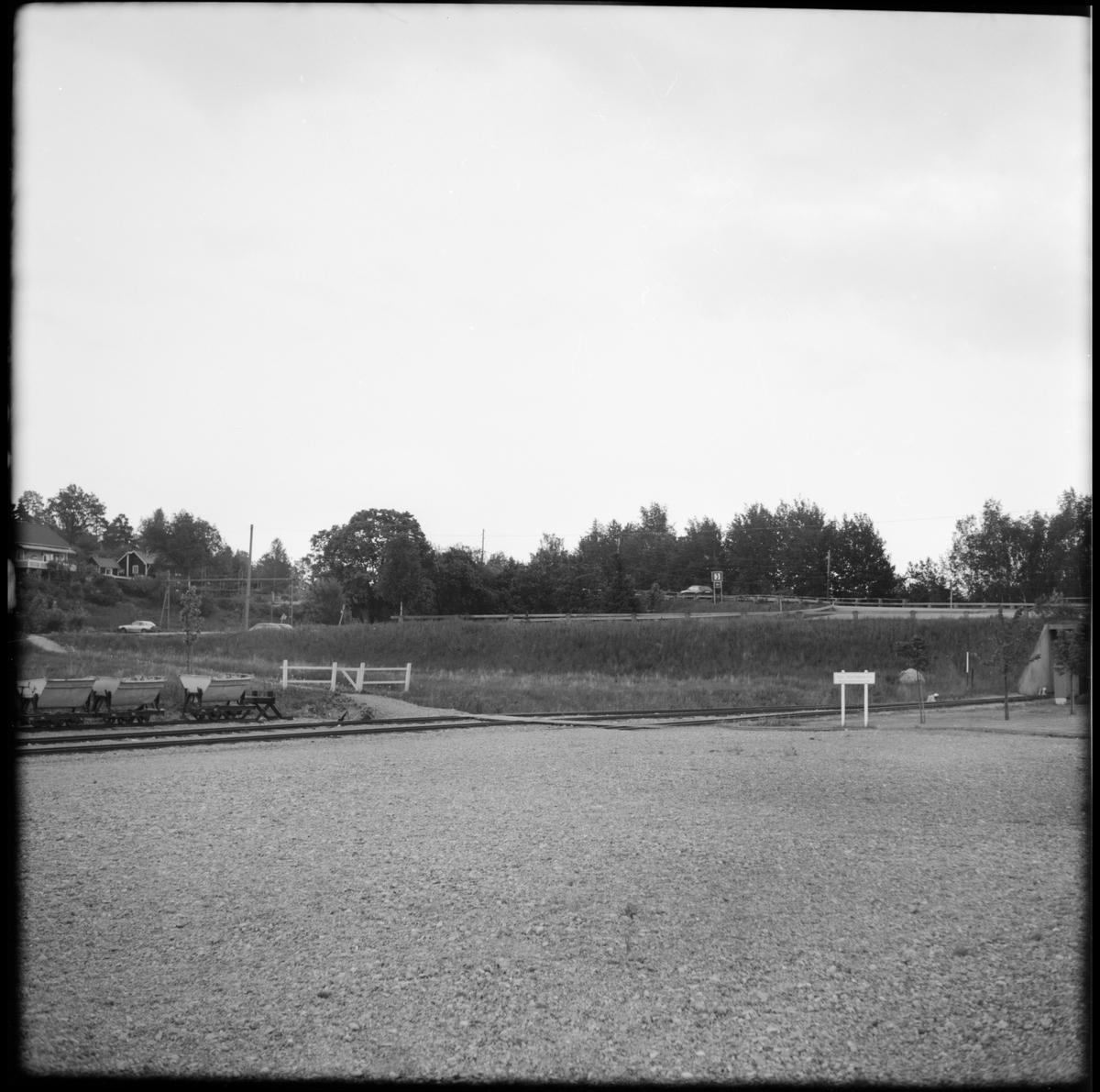 Del av Läggesta södra station. Tippvagnar till vänster i bild och väg 223 till höger i bild.