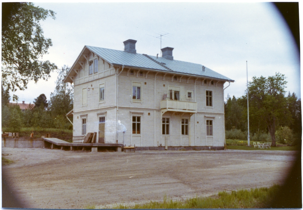 Stationen från vägsidan. Tvåvånings stationshus i trä av Hällnäsmodell. Byggår 1890