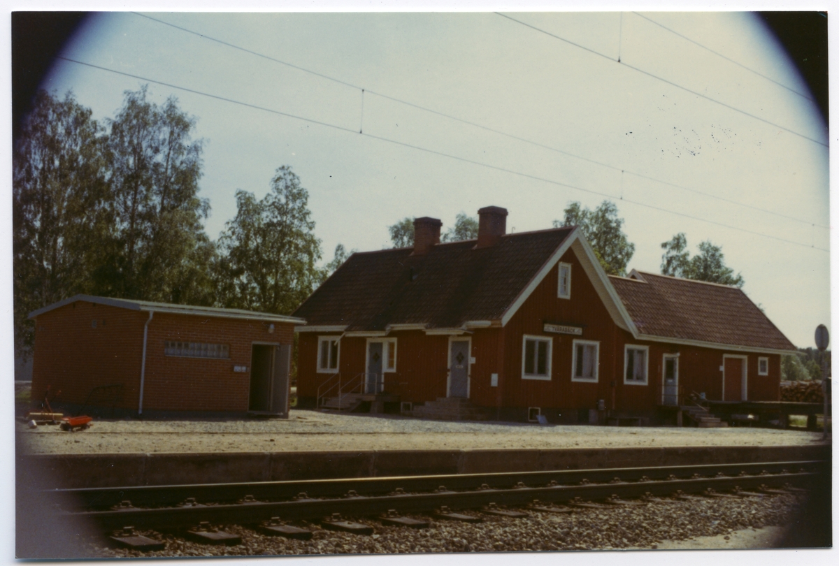 Envånings stationshus i trä, sammanbyggt i vinkel med godsmagasinet. Byggår 1917