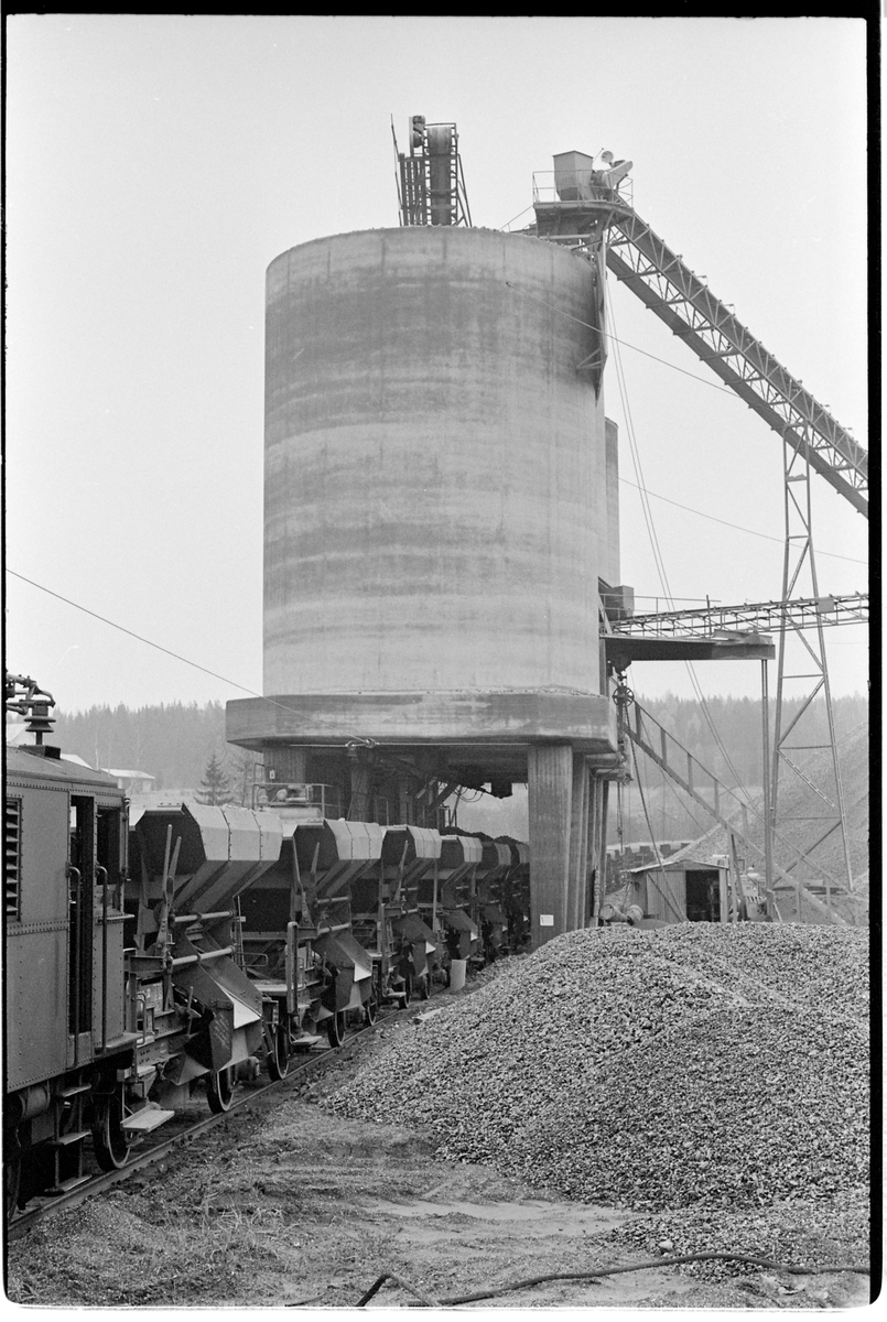 Titel: Bottentömningsvagnar, Statens Järnvägar, SJ Q 32. Lastning av makadam i Hjältakrossen.