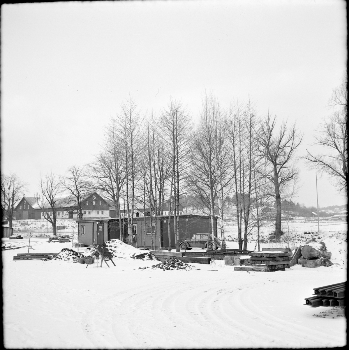 Husbyggnad på bangården i Mariefred som användes av Museijärnväg Östra Södermanlands Järnväg, ÖSlJ. Storgatan går förbi bakom huset.