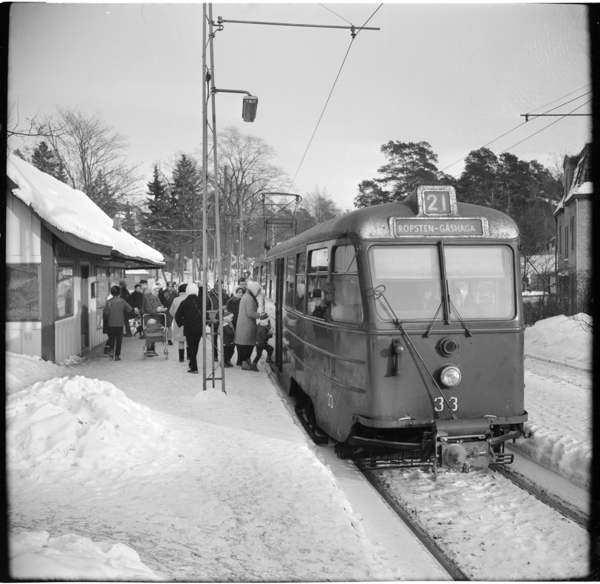 Trafik Aktiebolaget Stockholm Södra Lidingöns Järnväg, SSLidJ B24(A) 33 "ängbyvagn" linje 21 Ropsten - Gåshaga på hållplats vid Parkvägen.