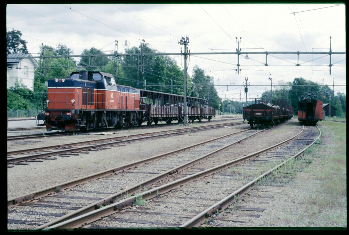 Statens Järnvägar, SJ T44 400 med vagnar lastade med skrot, Åkers Styckebruk.