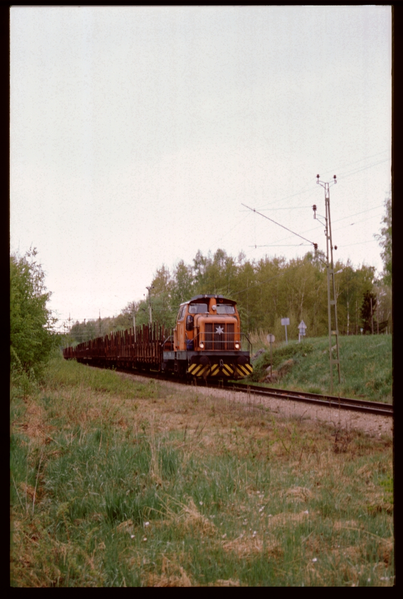 Trafikaktiebolaget Grängesberg–Oxelösunds Järnvägar, TGOJ V10 702 med godsvagnar öster om Eklången station.