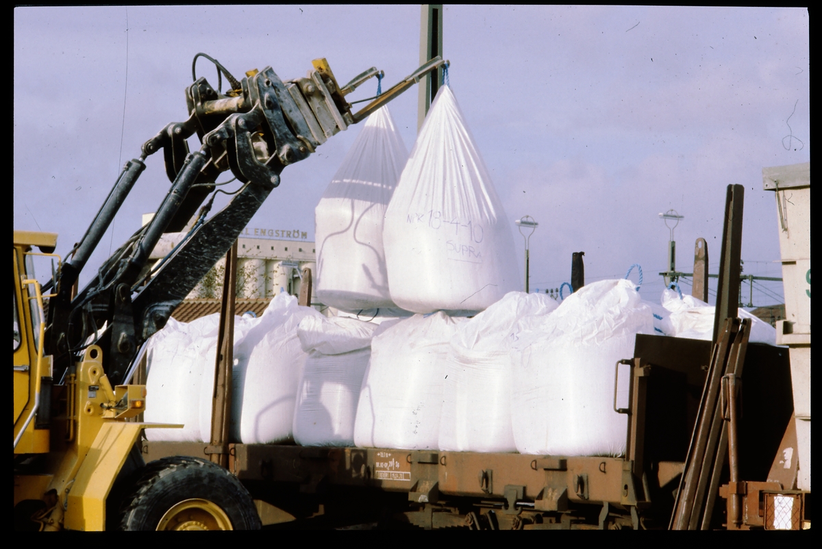 Lastning av storsäck på Statens Järnvägar SJ Rs.