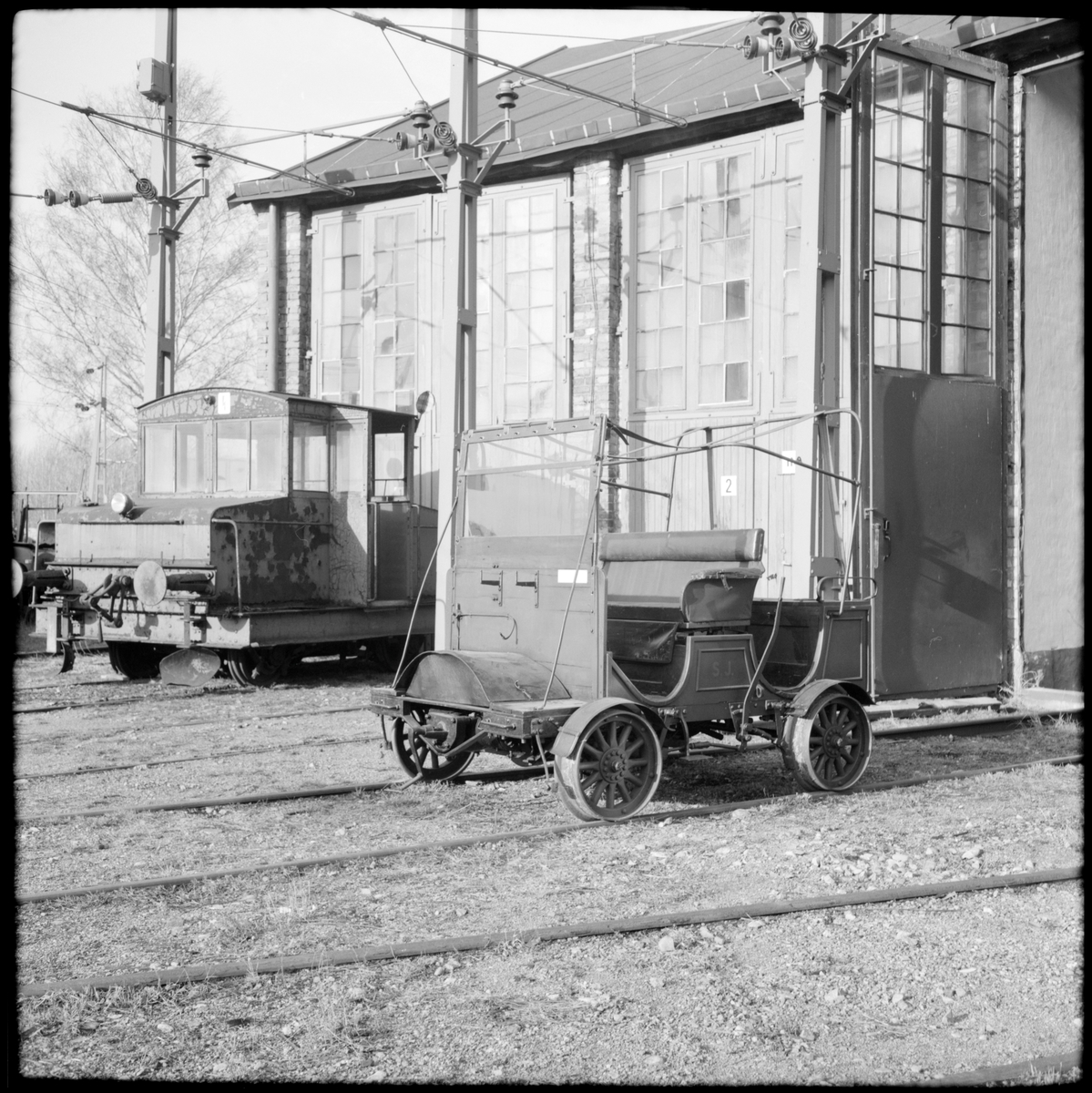 Statens Järnvägar, SJ motordressin 12 och en lokomotor utanför lokstallet i Hagalund.