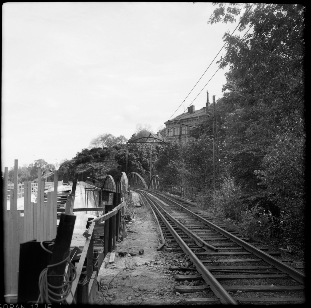 Tegelviksviadukten på linjen mellan Stadsgårdens station och Fåfängan, Saltsjöbanan. Till vänster i bild, bygget av den nya viadukten över Folkungagatan.