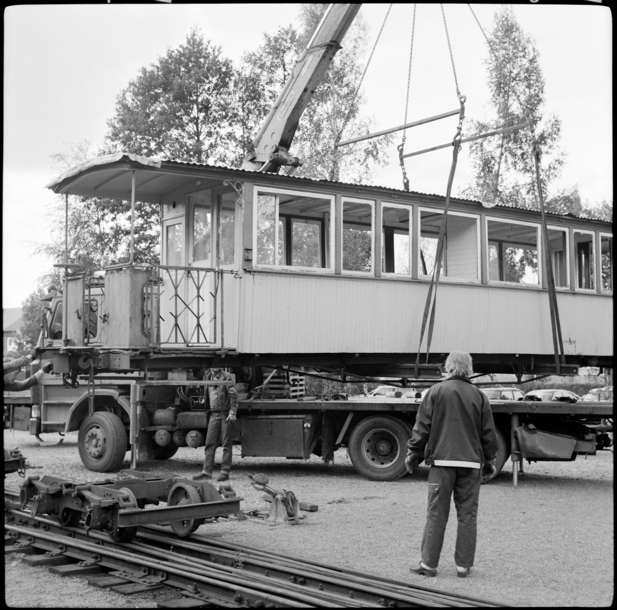 Personvagnar ankommer till Östra Södermanlands museijärnväg. Montering av korgen till underredet.