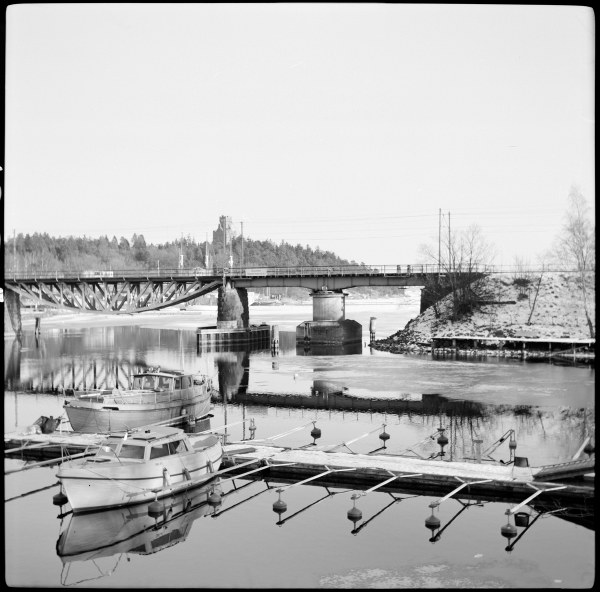 Järnvägsbro över Stocksundet på Roslagsbanan på linjen mellan Freskati och Stocksund. I bakgrunden Cedergrenska tornet.