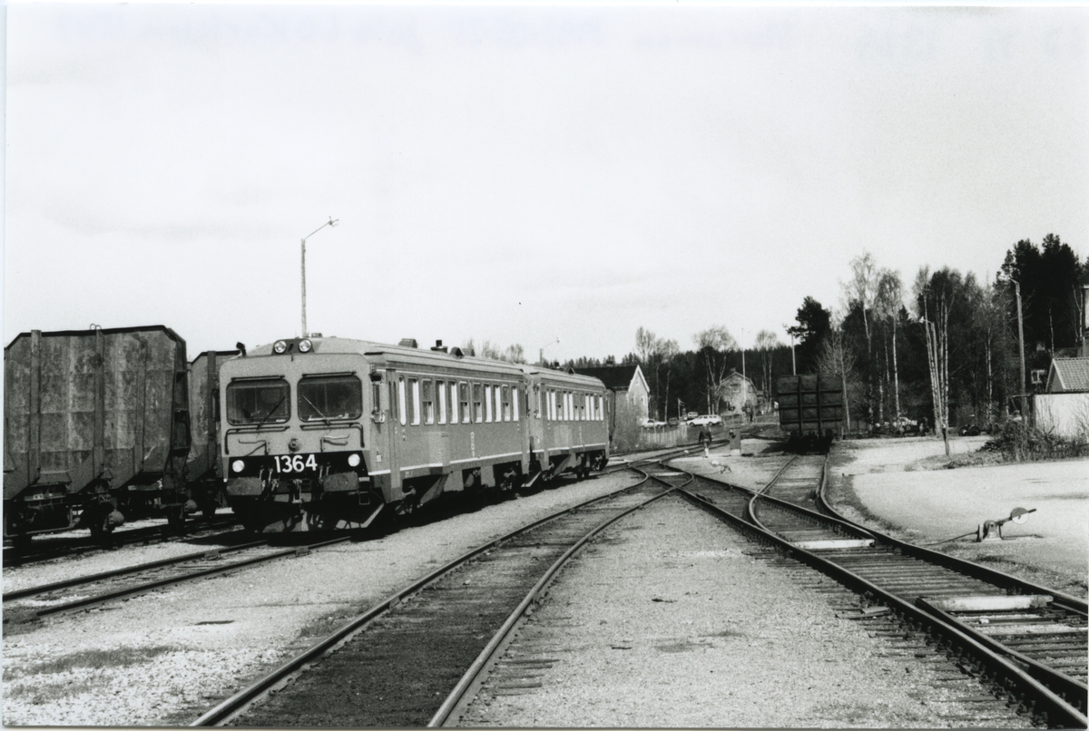 Motorvagn Statens Järnvägar, SJ Y1 1364, och timmertransportvagnar SJ Lp på Storumans stationsområde
