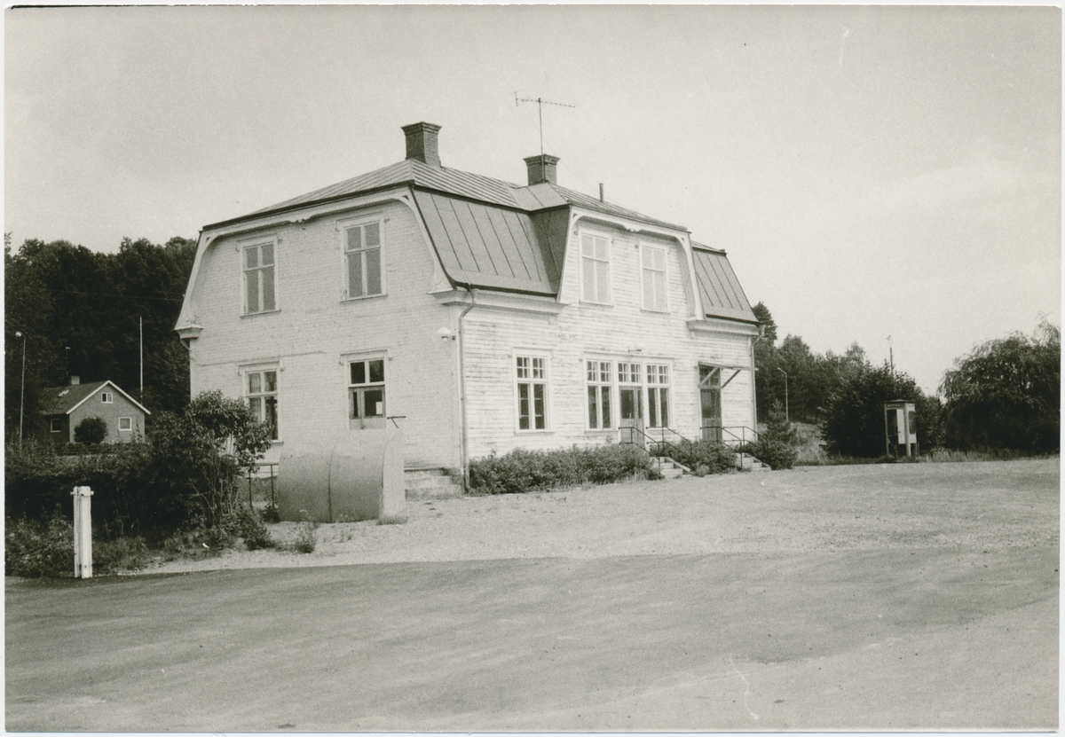 Stationshus från gatusidan efter nedläggningen. Stationen öppnad 1911. Godstrafiken nedlagd i etapper 1965-1986. Persontrafiken nedlagd 1984.