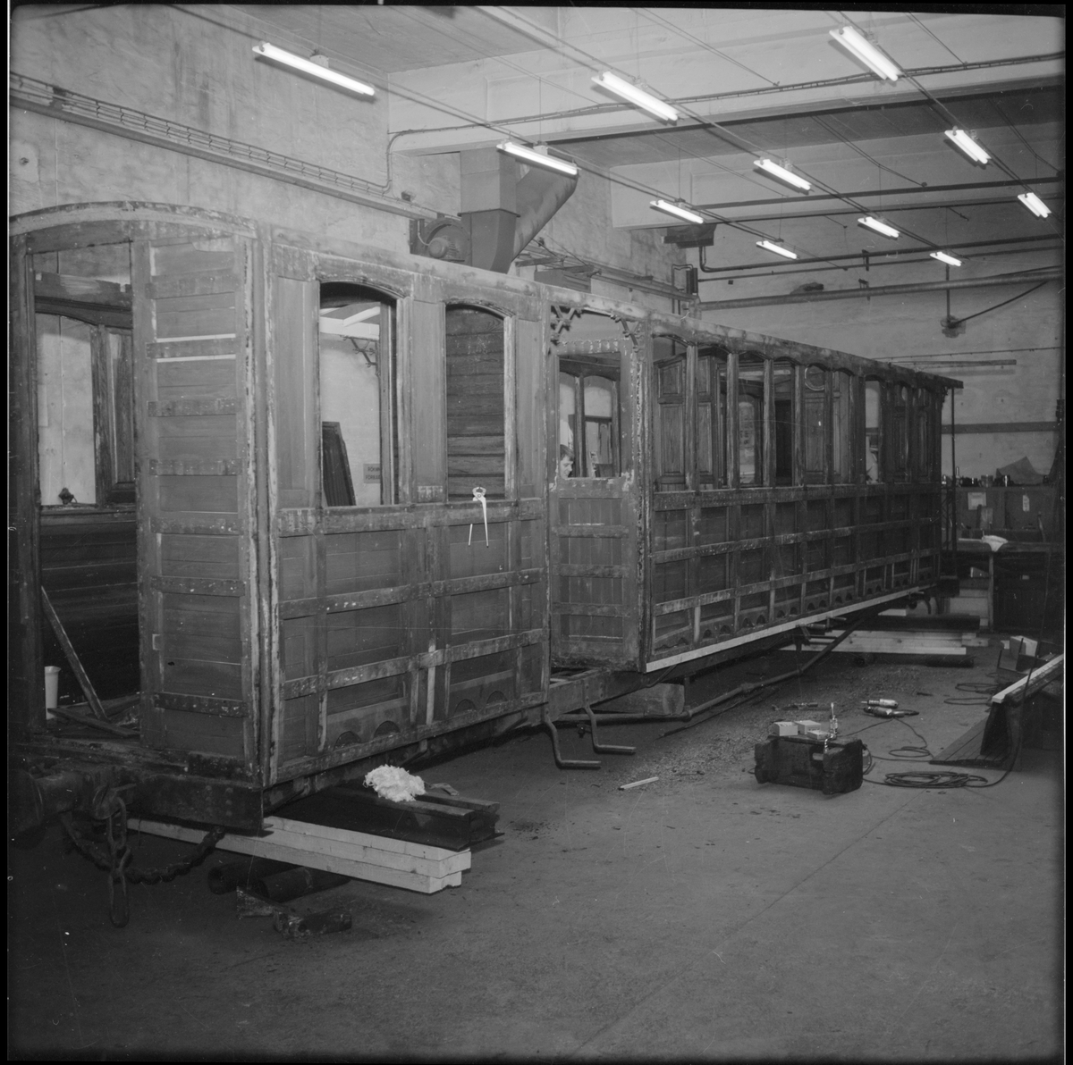 Restaurering av personvagn i verkstaden på Mariefreds järnvägsstation som användes av Museijärnväg Östra Södermanlands Järnväg, ÖSlJ.