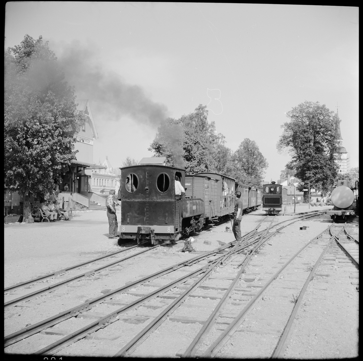 Museijärnvägen, Östra Södermanlands Järnväg, ÖSlJ ångtåg med lok 8 "Emsfors" närmast i bild på Mariefreds station.