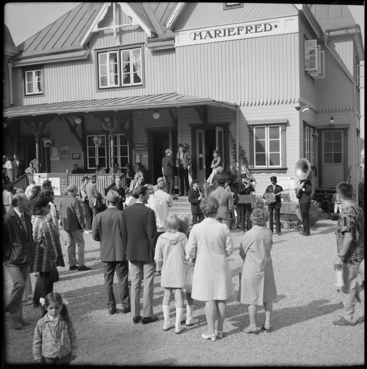 Museijärnväg Östra Södermanlands Järnväg, ÖSlJ musikkår Jernbanekapellet underhåller besökare på järnvägsstationen i Mariefred.