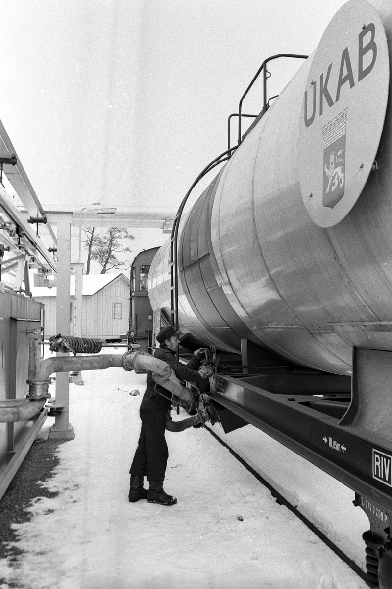 Oljetransport Uppsala - Gävle. Tankvagnsskylt med ägare: Uppsala Kraftvärme AB. Överföringsrör med bajonettkoppling