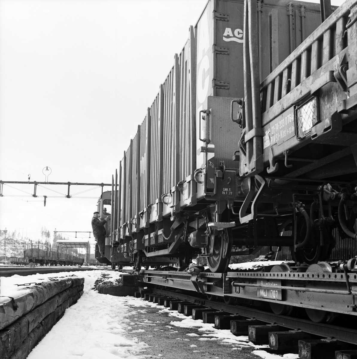 Normalspåriga godsvagnar lastade på smalspårig överföringsvagn från Nordmark - Klarälvens Järnvägar, NKlJ.