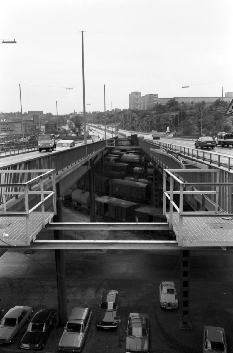 Liljeholmsbron. Liljeholmens bangård under broarna. Fotot taget mot söder.