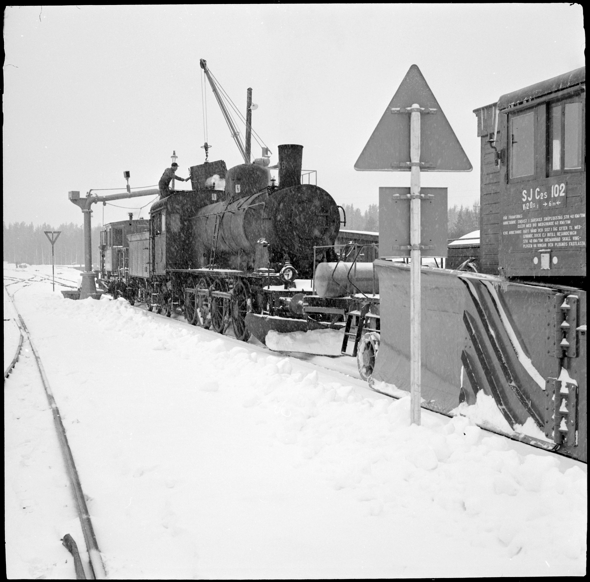 Plogloket bunkrar i Hoting. Tillhöger skymtas SJ C2s 102. Statens Järnvägar.