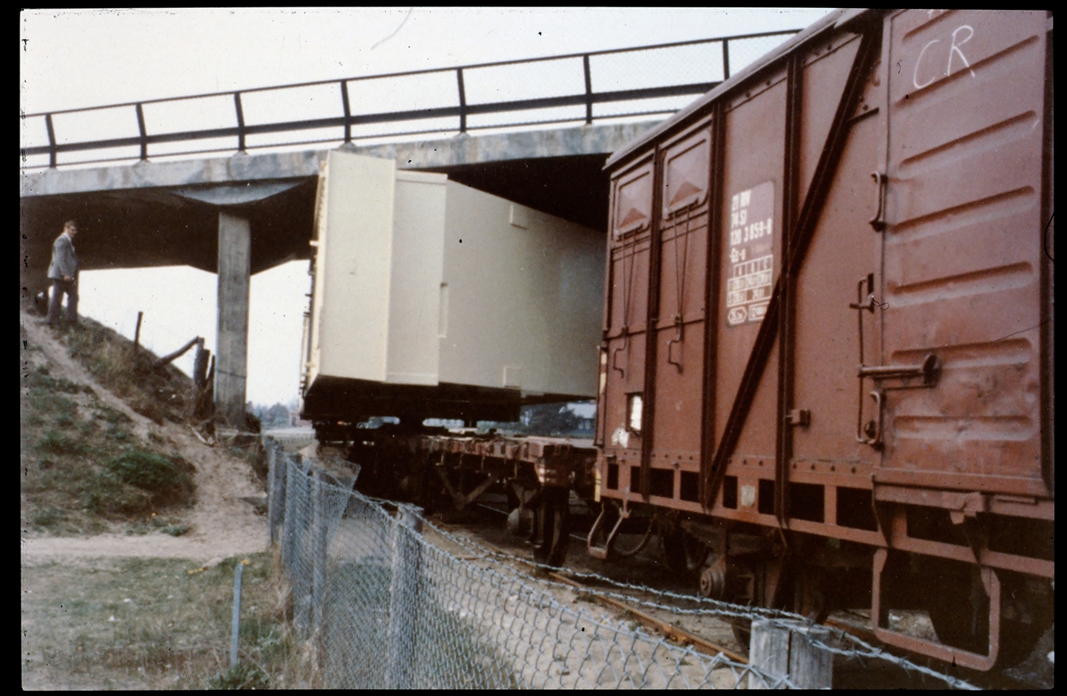 Transport av jättebalkar på sträckan mellan Långebro och Åhus. Här troligen under Åhusvägen. SJ Gs-u 21 74 120 3 859.