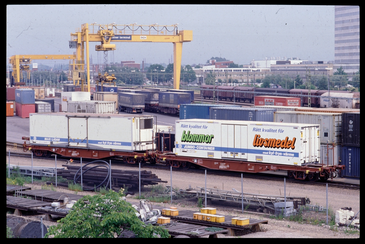 Malmö godsbangård. Statens Järnvägar, SJ Sgjnqss-w 82-74-458 1 000-1 med container.