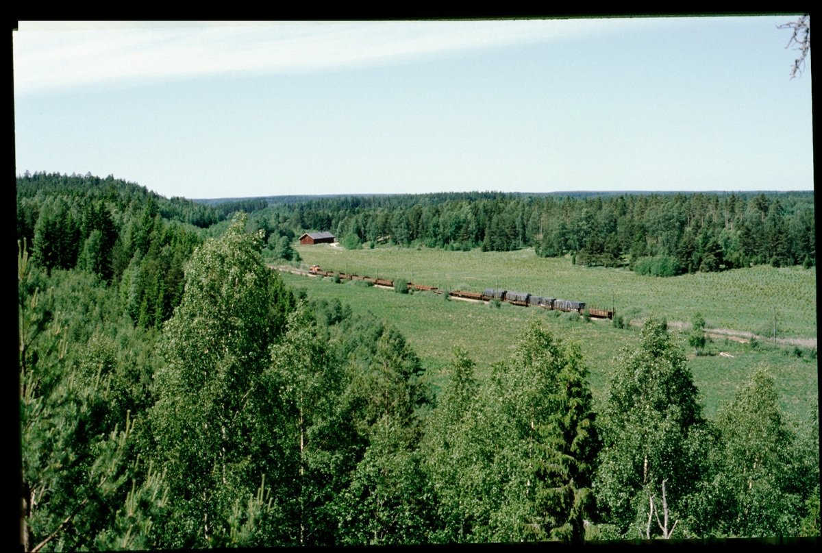 Vy över järnvägen i närheten av Åsäng. På spåret syns Trafikaktiebolaget Grängesberg–Oxelösunds Järnvägars diesellok TGOJ V10 701 med godsvagnar.