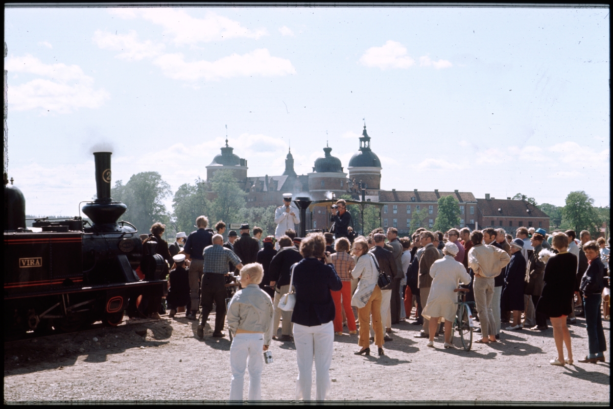 Invigning av hamnspår i Mariefred. Troligtvis håller Sven Fredén tal. Stafsjö Järnväg lok 2 "VIRÅ".