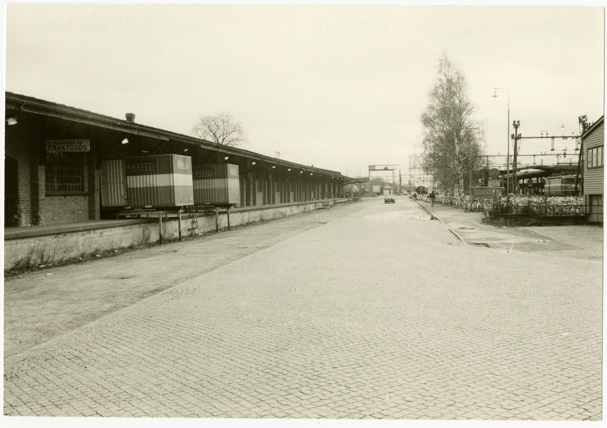 Vy vid Uppsala godsmagasin. Till höger i bilden ser man elloket. Statens Järnvägar, SJ Rc2 1104.
