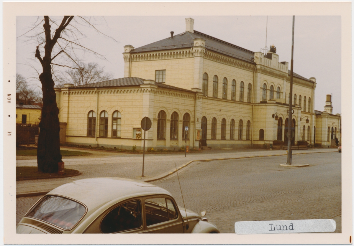 Lund station 1971. Statens Järnvägar, SJ. Stationen öppnade 1858. Det första stationshuset började byggas i början av 1950-talet men stod klart först 1958. Ett nytt stationshus byggdes 2001. Banan elektrifierades 1933.