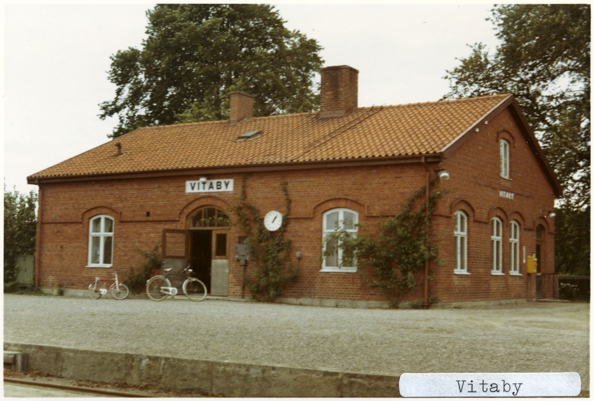 Vitaby station 1971. Ystad - Brösarps Järnväg, YBJ. Stationen öppnades 1901. Stationshuset byggdes 1901. Övergick till Statens Järnvägar, SJ 1941. Stationen används nu av museijärnvägen.Banan elektrifierades 1996.