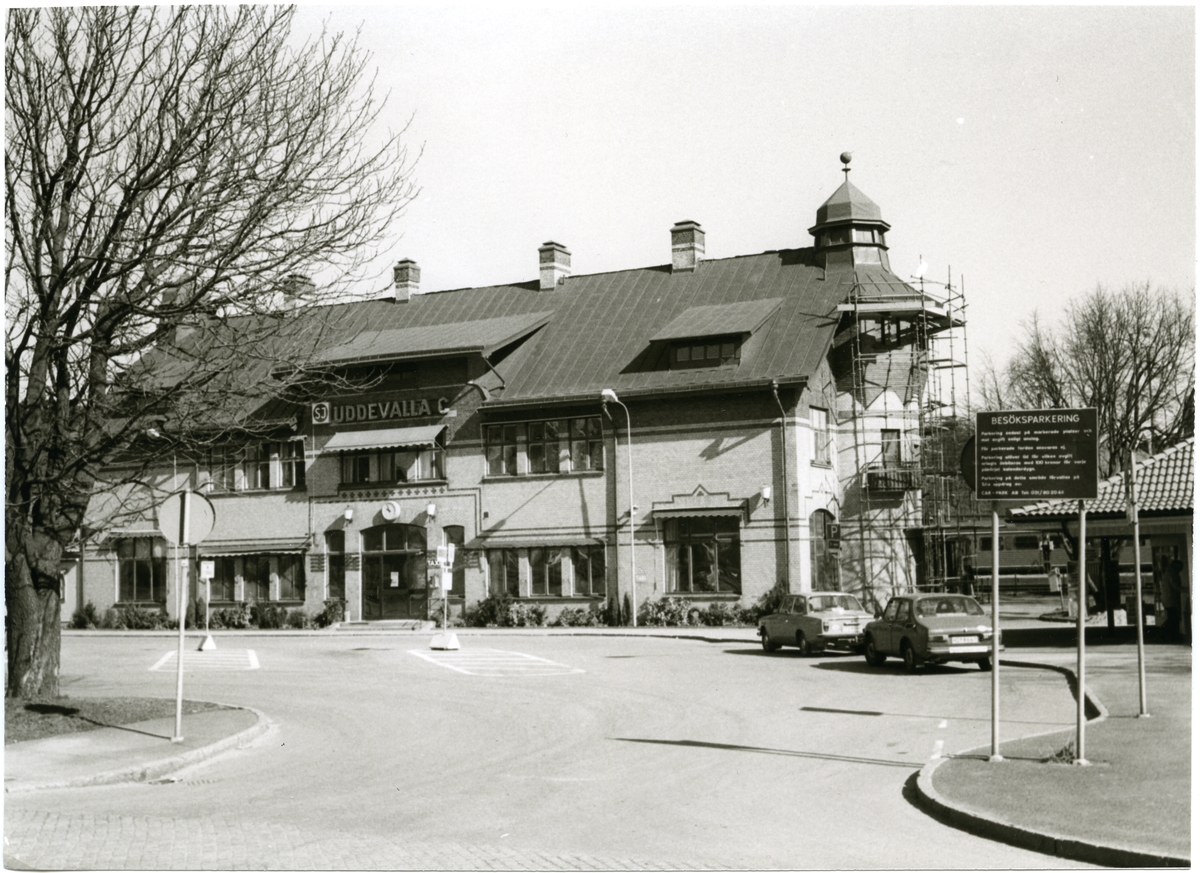 Uddevalla station från gatusidan. I förgrunden syns en Volvo 140 och en Saab 99.