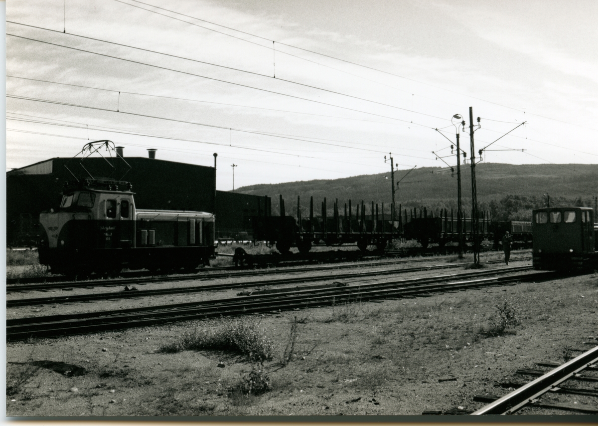 Hagfors godsbangård. Nordmark - Klarälvens Järnväg, NKlJ ellok 103 "Skoghall" till vänster i bild. NKlJ lok 501 till höger.