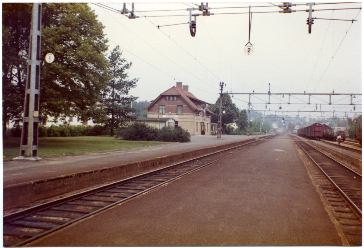 SJ-stationen anlades 1905.Stationshuset, i två våningar i sten, moderniserades 1936. Pressbyrån har kiosk med servering vid stationen.