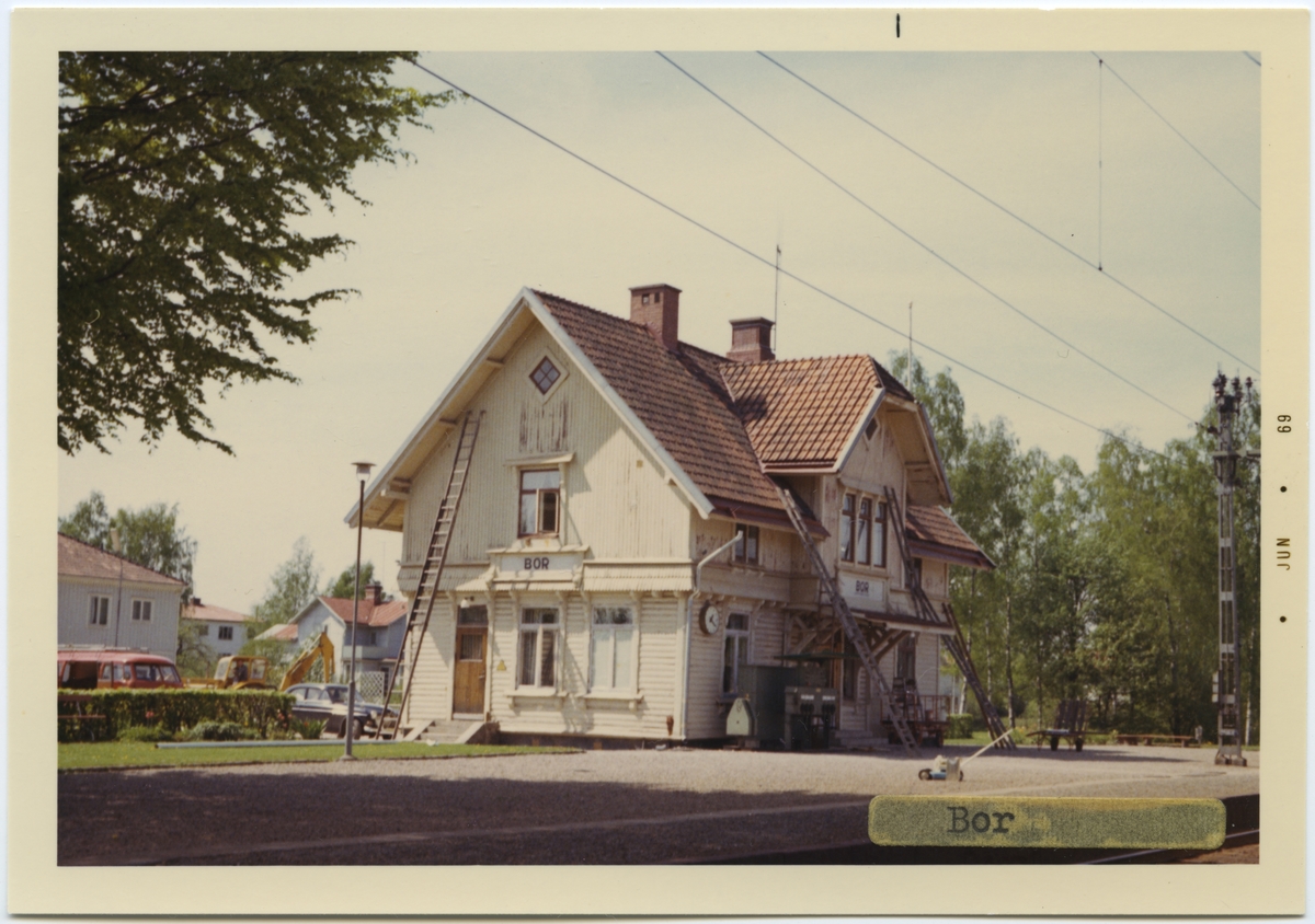 Vy vid Bor.Stationshus byggt 1902. enligt ritningar av arkitekt TJ Folcke, Göteborg, Tvåvånings stationshus i trä. Mekanisk växelförregling