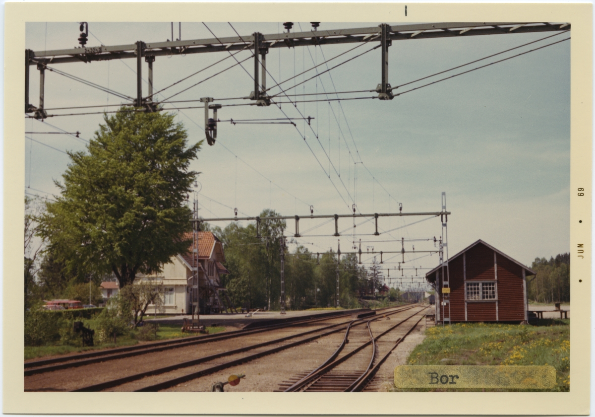 Vy vid Bor.Stationshus byggt 1902. enligt ritningar av arkitekt TJ Folcke, Göteborg, Tvåvånings stationshus i trä. Mekanisk växelförregling