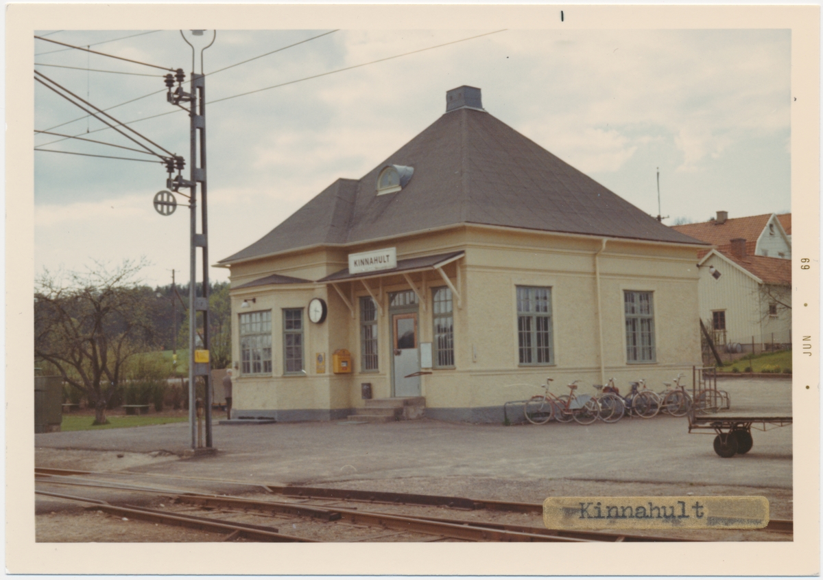 Titel: Vy vid Kinnahult. Namnet var tidigare KÄLLÄNG. Station anlagd 1918. Envånings stationshus byggt 1919 enligt Harald Söderberg, Varberg , putsat och med toppigt tak. Mekanisk växelförregling