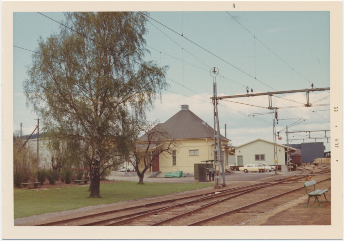 Vy vid Kinnahult. Namnet var tidigare KÄLLÄNG. Station anlagd 1918. Envånings stationshus byggt 1919 enligt Harald Söderberg, Varberg , putsat och med toppigt tak. Mekanisk växelförregling