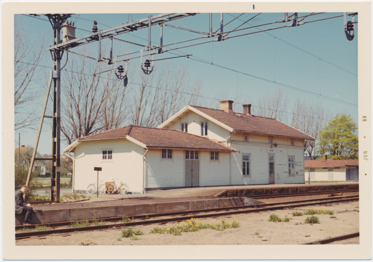 Vy vid Derome. Hette tidigare ÅSBRO. Trafikplats anlagd 1890. Envånings stationshus i trä byggt 1880, sammanbyggt med godsmagasinet. Bostadslägenheten reparerades 1943. Elektrisk växelförregling
