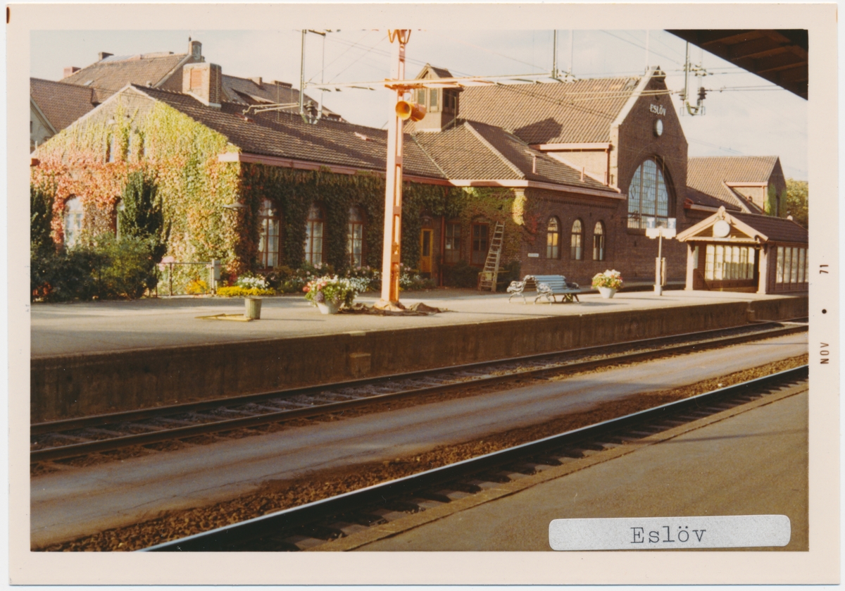 Eslövs station 1971. Statens Järnvägar, SJ. Stationen öppnades 1858. Stationshuset byggt 1863, byggdes till 1903 och 1913 och byggdes om 1913. Fick dubbelspår 1901.Banan elektrifierades 1933.