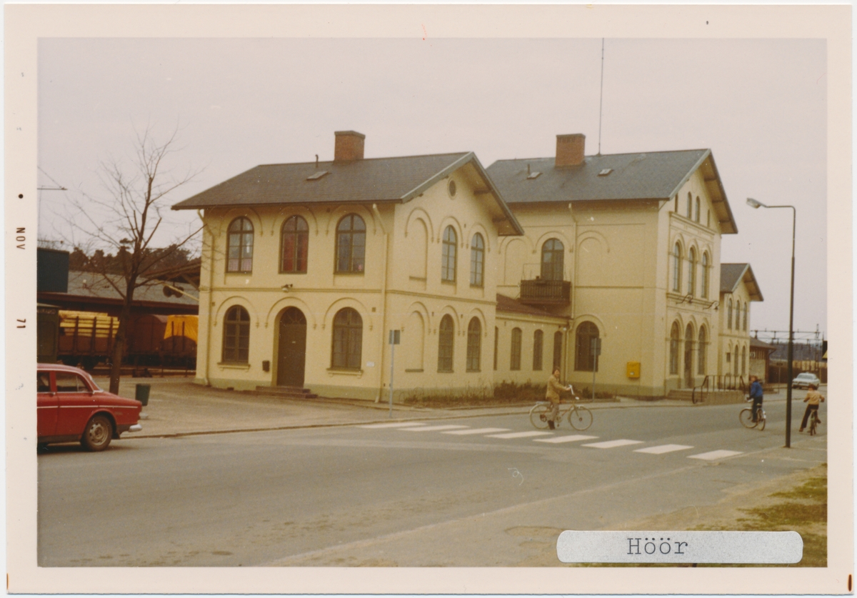 Höör station 1971. Statens Järnvägar, SJ. Stationen öppnades 1858. Stationshuset byggdes 1858 och moderniserades 1930. Fick dubbelspår 1904. Banan elektrifierades 1933.