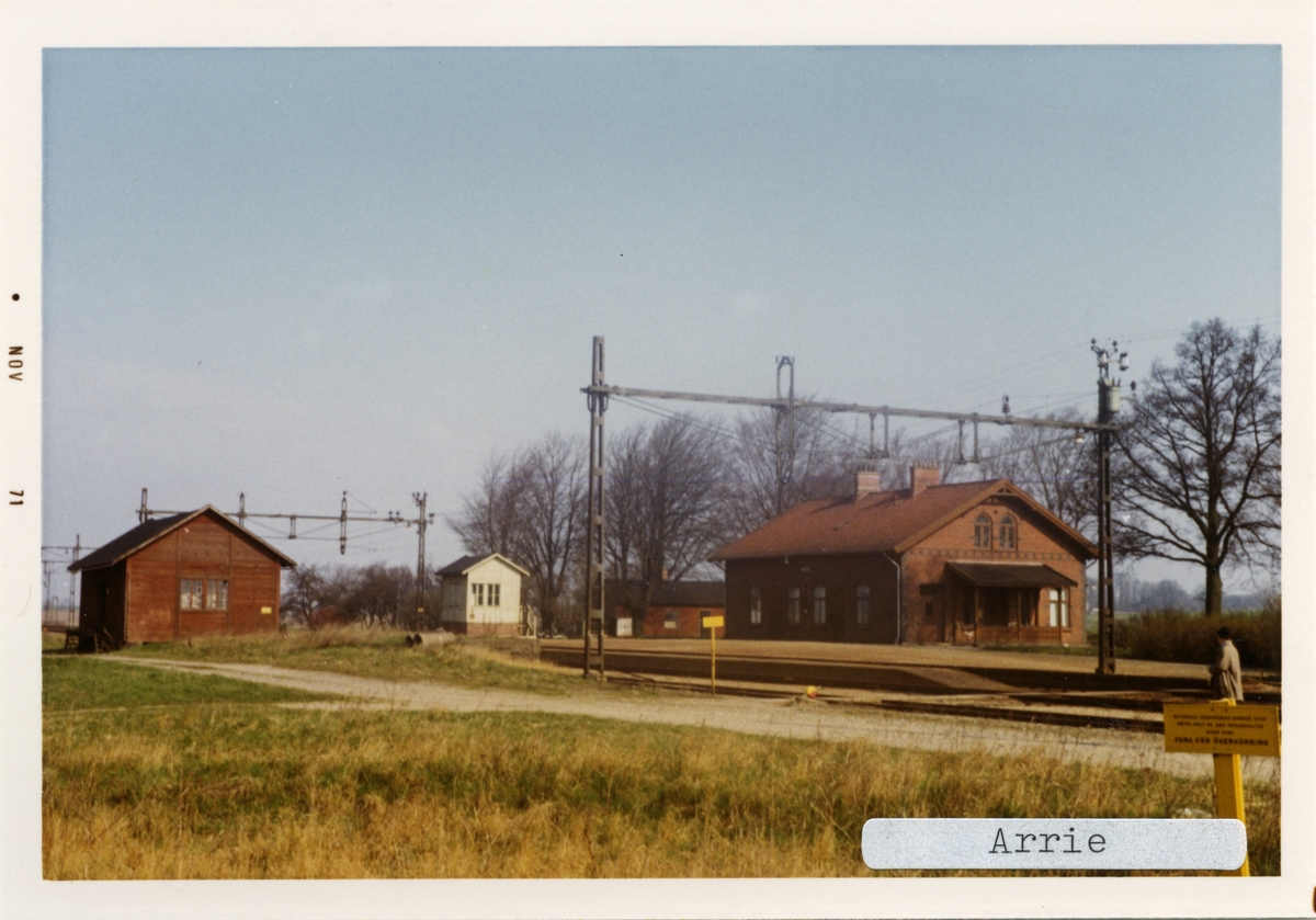 Arrie station 1971. Malmö - Ystad Järnväg, MYJ. Stationen öppnades 1898. Blev hållplats 1967 och nedlagd 1970. Banan elektrifierades 1933. Kvar som trafikteknisk station till 1971.
