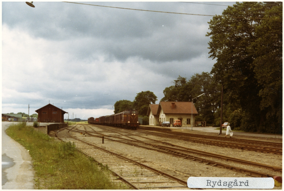 Rydsgård station 1971. Malmö - Ystad Järnväg, MYJ. MYJ. Stationen öppnades 1874. Stationshuset byggdes 1876 och avbemannades1978. Övergick till Statens Järnvägar, SJ 1941. Banan elektrifierades 1996. Loket är troligen ett SJ T21.