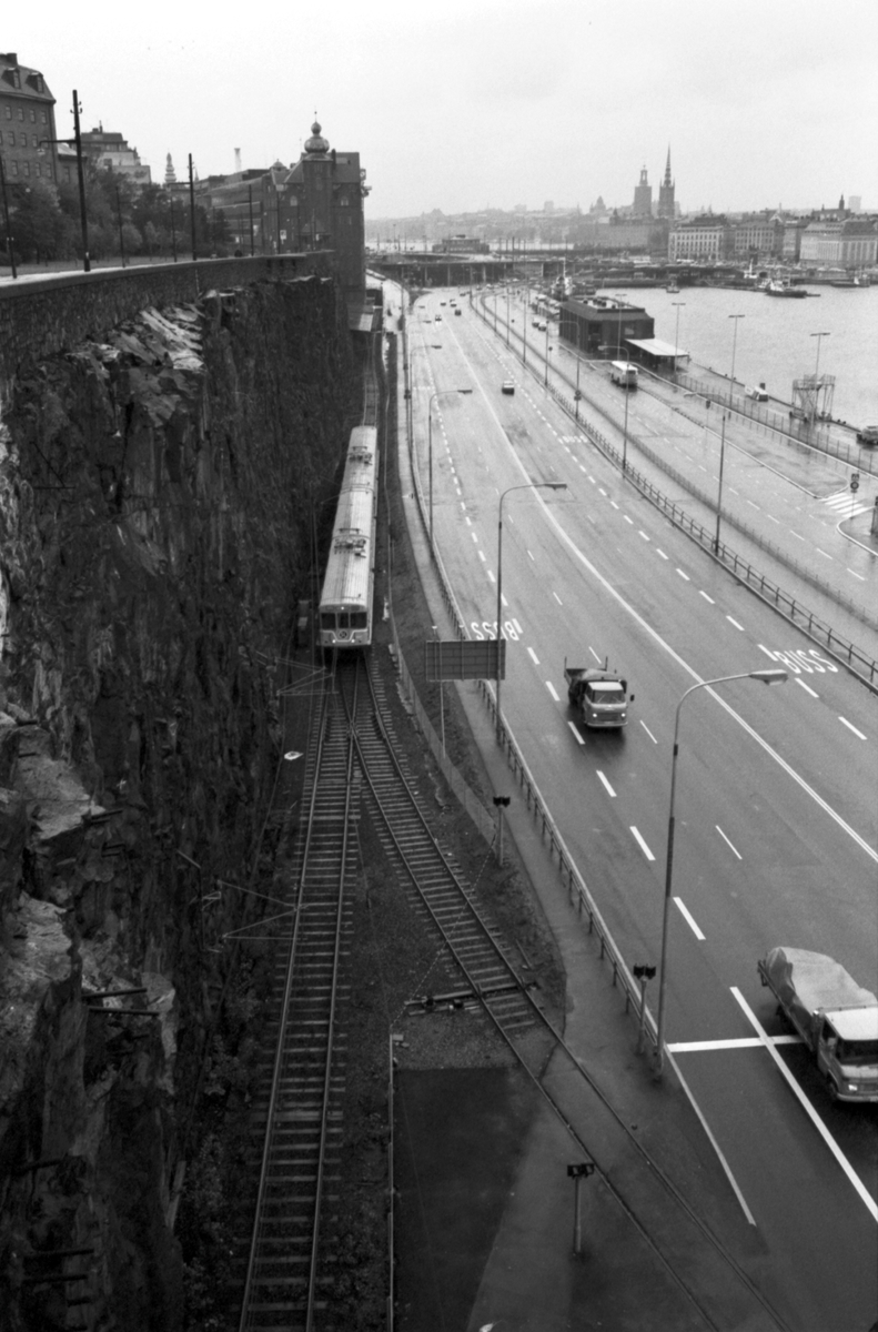 Stadsgården. "pendeltåg" trafikerande Saltsjöbanan vid växel till Stadsgårdhamnens hamnspår straxt innan Saltsjöbanan går in i Stadsgårdstunneln.